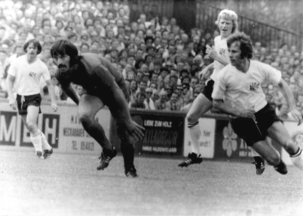 Beim „Skandalspiel“ in Mannheim wurde Dieter Baumanns (vorne) vom Ex-Nullachter Charly Adler (links) gegen die Bande befördert. Links hinten ist Kaspar Strittmatter in der Mitte Wolfgang „Atze“ Hauke zu erkennen.