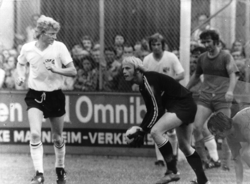 In der 87. Minute rauft sich Nullachter Walter Gruler (Nr. 10) verzweifelt die Haare, während der Ball beim entscheidenden Elfmeter zum 0:1 rechts im Netz landet und dem VfR Mannheim den Sieg beschert.