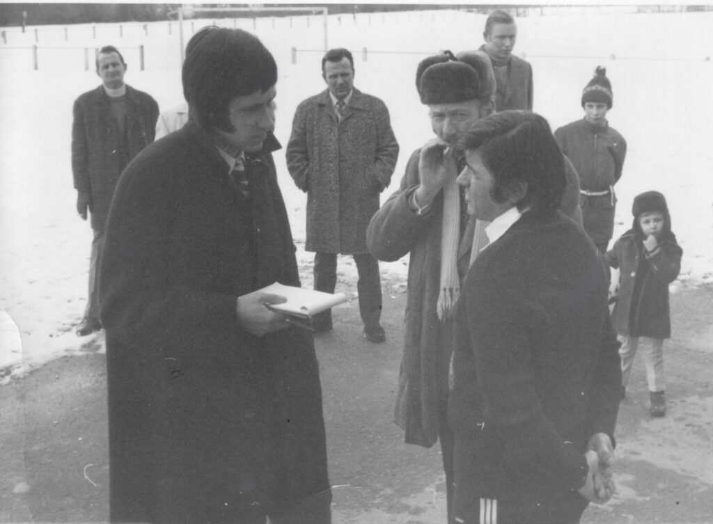 Der neue Coach Anton Rudinski (rechts) war ein beliebter Gesprächspartner bei der Presse. In der Mitte hört der zweite 08-Vorsitzende Emil Schmeckenbecher aufmerksam zu.