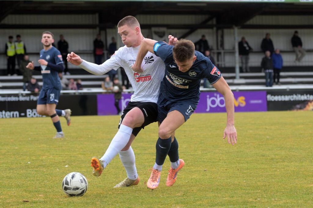 Es war Duell mit intensiven Duellen wie hier mit FC 08-Verteidiger Jonas Busam (Mitte). Foto: Tobias Baur