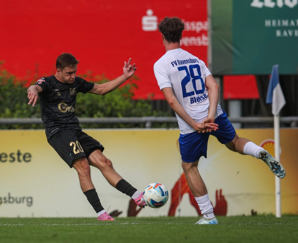 Fast konnte man den Eindruck gewinnen, dass dieser Warnschuss bei den Villingern ihren Effekt hatte. Denn schon in der 53. Minute erzielte Fabio Pfeifhofer nach schöner Vorlage von Kevin Müller mit einem satten Schuss das 0:2. Jetzt schienen die 08er auf der Siegerstraße zu sein. Doch eine Unaufmerksamkeit führte in der 65. Minute zum Anschlusstreffer. Jonas Busam verlor an der Torauslinie den Ball und Daniele Gabriele verkürzte für Ravensburg zum 1:2, was noch mal Hoffnung bei den Turmstädtern aufkommen ließ.